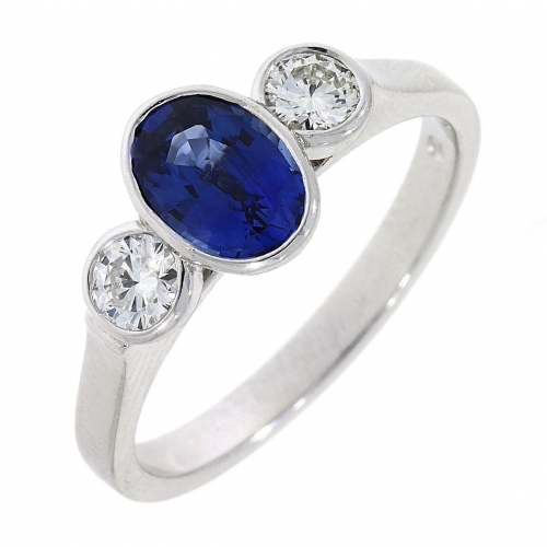 This elegant 3 stone ring is set with an oval blue sapphire between two round brilliant cut diamonds.
